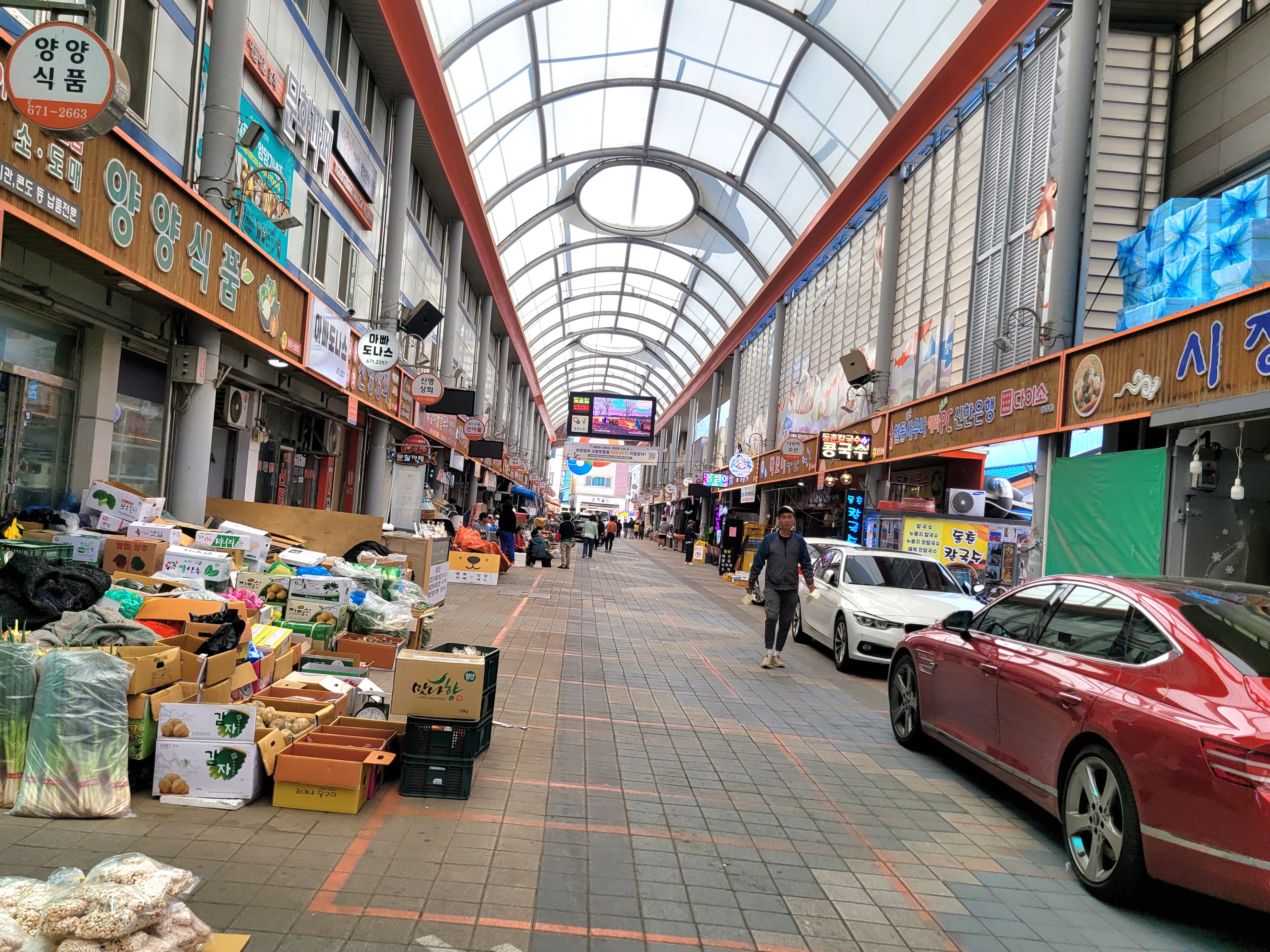 골목 골목마다 가게들이 들어서 있었지만, 일부 골목에는 차량이 주차되어 있어 시장 특유의 골목길 정취가 약했습니다. 그래서 시장이라기보다는 깔끔한 쇼핑 골목을 걷는 느낌이었어요. 장날이 아니면 양양전통시장은 활기가 많이 떨어진다는 것을 실감했습니다. 다음에는 5일장에 맞춰 방문하고 싶다는 생각이 들었어요.
