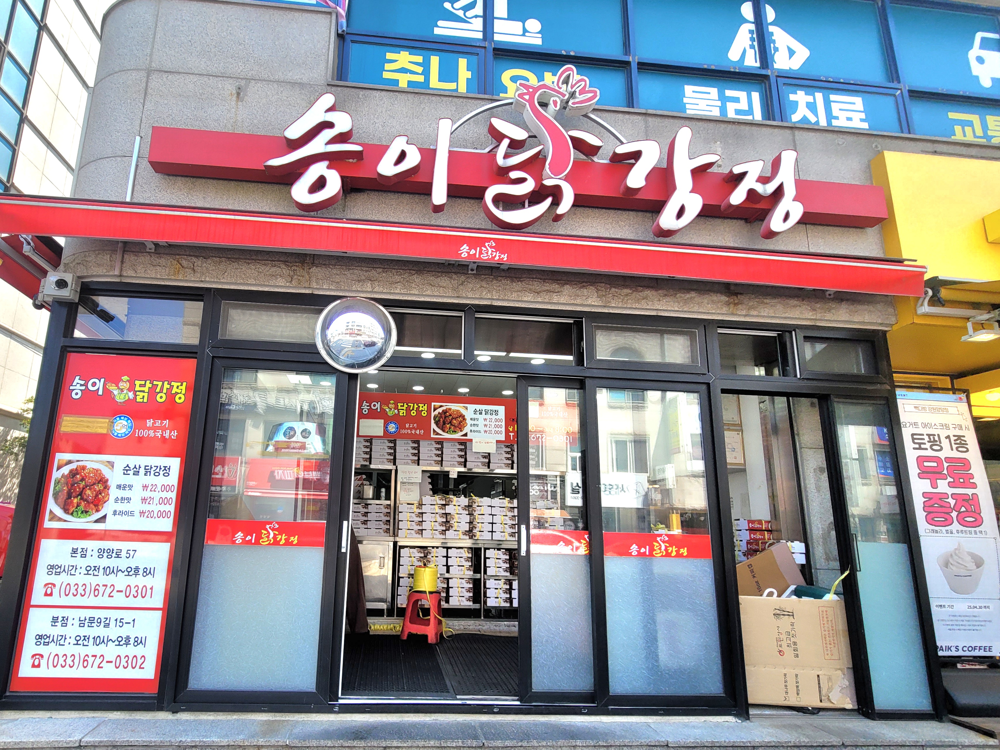 낙산해수욕장으로 가기 전, 양양전통시장에 먼저 들렀어요. 이곳에는 닭강정으로 유명한 송이닭강정이라는 가게가 있는데요, 본점과 분점이 운영 중이라 선택의 폭도 넓답니다.