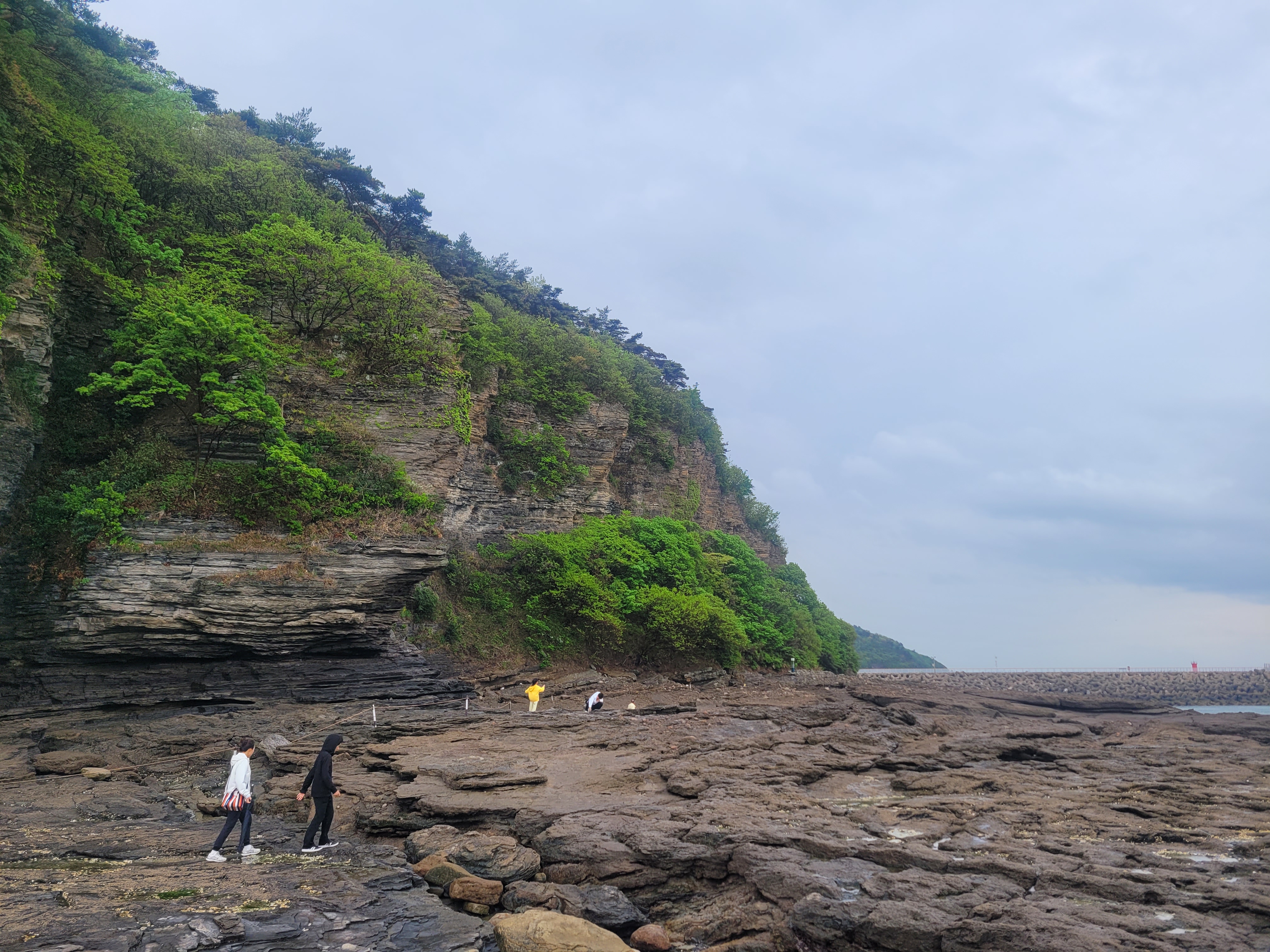 간식을 먹고 도착한 곳은 전북 부안에 위치한 채석강(彩石江)입니다. 출발할 때는 맑았지만 휴게소를 지나면서 비가 앞이 보이지 않을 정도로 쏟아졌어요. 실외 여행지라 걱정했지만, 다행히 도착했을 때는 비가 잦아들었습니다.