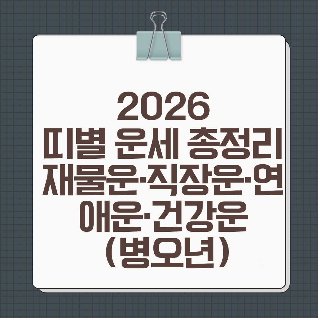 2026년 병오년은 ‘열정과 변화’의 기운이 강한 해입니다. 직업적인 전환, 인간관계 재정비, 금전의 흐름 변화가 포인트입니다. 본문에서 12띠의 재물운·직장운·연애운·건강운을 상세히 안내합니다.
