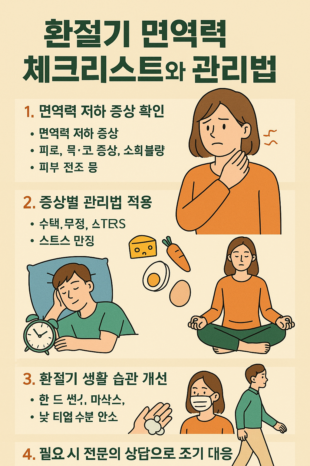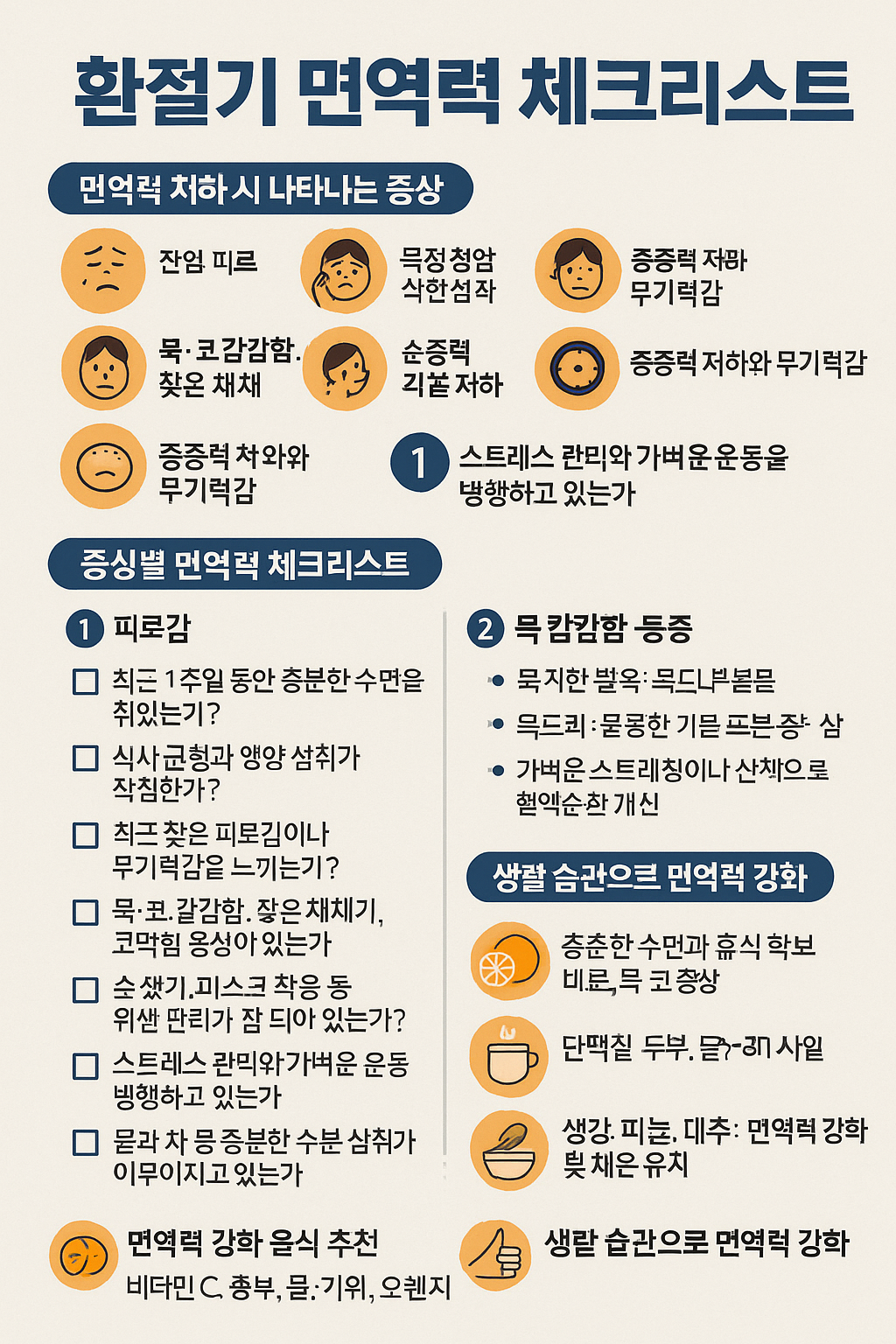 환절기에는 일교차가 크고 기온 변화가 잦아 면역력이 쉽게 떨어집니다. 피로감, 목·코 칼칼함, 잦은 감기 등 다양한 증상이 나타날 수 있는데, 이를 조기에 체크하고 관리하는 것이 중요합니다. 오늘은 환절기 면역력 체크리스트와 증상별 관리법을 자세히 소개합니다.