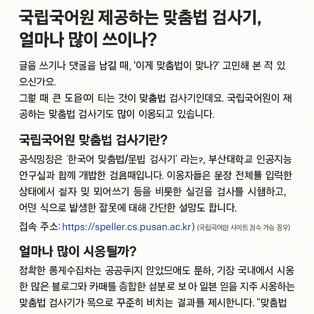 글을 쓰다 보면 가장 먼저 부딪히는 고민은 맞춤법과 띄어쓰기입니다. 일상 대화에서는 대충 넘어가도, 검색엔진과 독자에게는 작은 오류 하나가 글의 신뢰도를 크게 깎습니다. 그럴 때 기대게 되는 것이 바로 국립국어원이 제시하는 기준입니다. 국립 기관이 제시하는 원칙과 대중적 활용성을 겸비한 검사기는 한국어 글쓰기에 사실상 표준처럼 자리 잡았습니다.