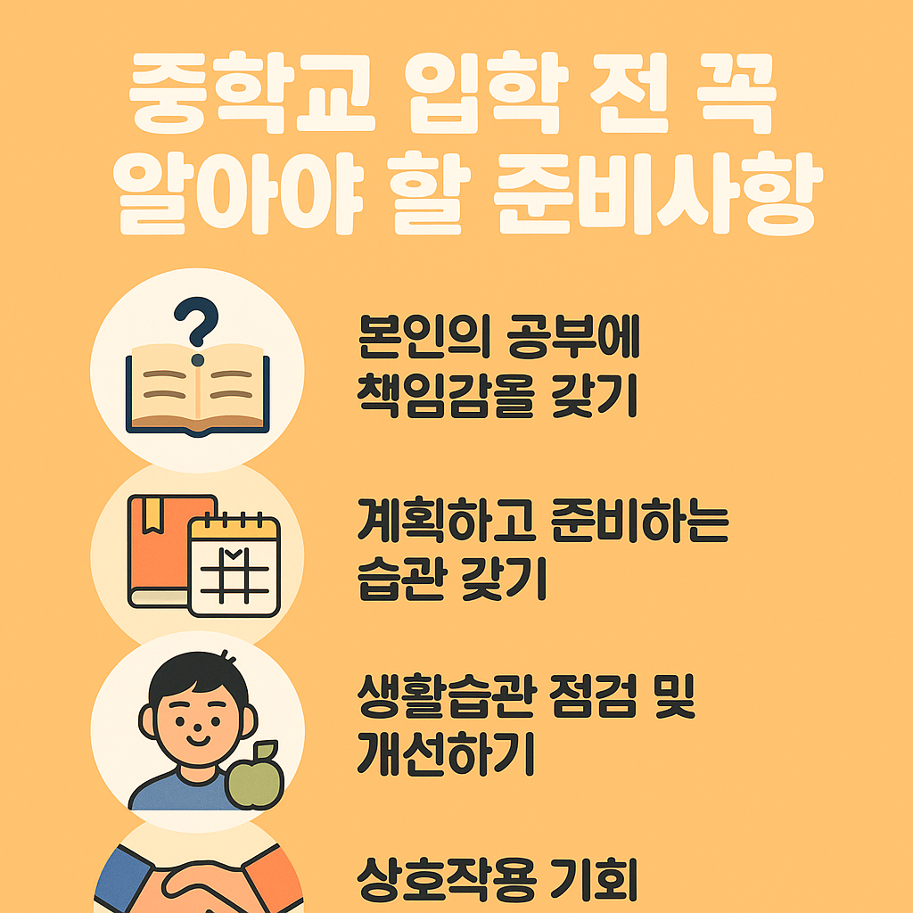 초등학교 6학년에서 중학교로 올라가기 전, 무엇을 어떻게 준비해야 할지 막막한 분들이 많습니다. 새로운 환경에 잘 적응하고, 공부와 생활을 슬기롭게 시작하려면 미리 준비가 필요합니다. 이번 글에서는 중학교 입학 전에 꼭 준비해야 할 학습, 생활, 마음가짐을 자세히 정리했습니다.