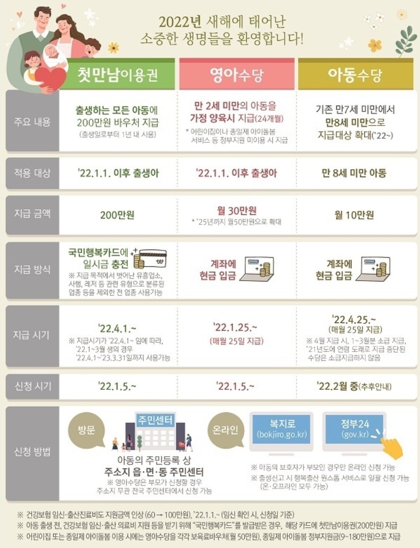 - 2022년 1월 1일 이후 출생아부터 출생에 당 2백만 원을 지원받게 됩니다.