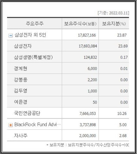 삼성전기의 최대주주는 3월 11일 기준으로 했을 때 삼성전자로 23.69%의 지분을 가지고 있으며 블랙록이 지분 5%를 소유를 하고 있고, 외국인 지분율은 29.17% 입니다.