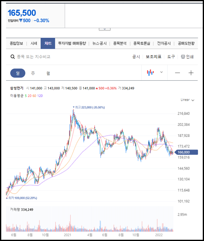 삼성전기 주가분석을 하면 등락이 있기는 하지만 주가가 천천히 올라가고 있는 것을 볼 수 있습니다. 2021년 1월 쯤에 최고점 223,000원을 찍고 박스권에 들어와있는 것을 볼 수 있는데, 매물대가 173,500원이었습니다. 현재 주가가가 매물대보다 아래에 있는 166,000원에 있기 때문에 당분간은 하락세에 머무를 것으로 판단이 됩니다.