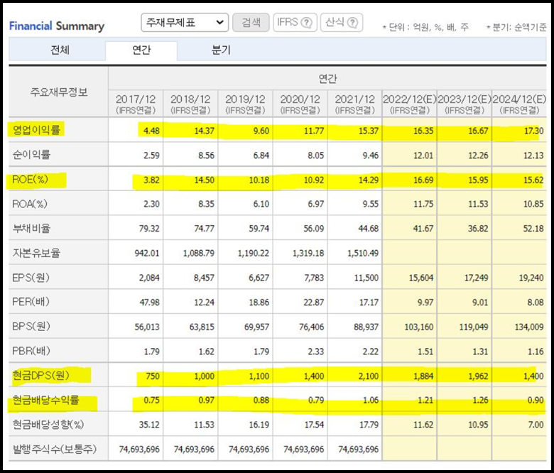 삼성전기의 영업이익률, ROE도 꾸준하게 증가를 하고 있고, 배당금도 계속해서 증가를 하고 있는 것으로 보아 주주확원에도 신경을 쓰고 있는 기업이라 할 수 있습니다.