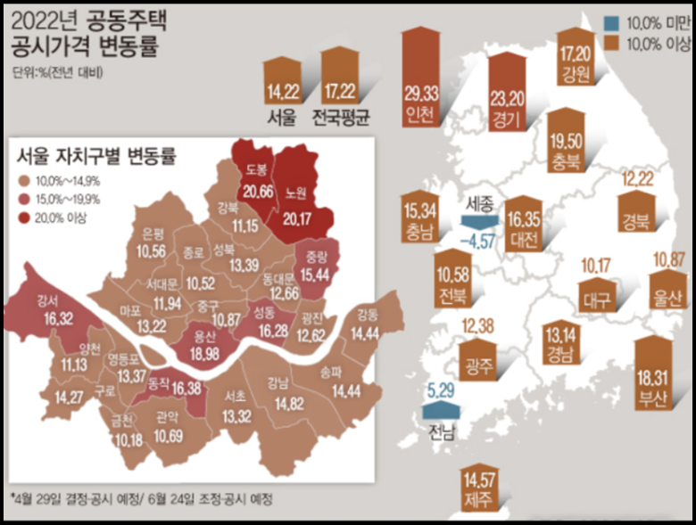 올해 공동주택 공시가격은 17.22% 상승했고 서울은 14.22% 상승했습니다. 인천, 경기 지역의 상승세가 눈에 띄고 전남이 가장 적게 상승, 그리고 세종은 -가 됐습니다. 충북, 부산도 많이 높아졌습니다.
