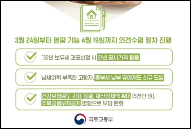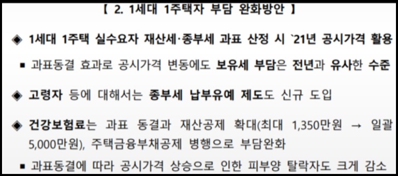 공시가격이 올라 세금 부담이 늘어날 수 있는 만큼 1가구 1주택자를 대상으로 보유세 부담 완화 방안도 함께 발표했습니다. 1가구 1주택자를 대상으로 올해 재산세종부세 과세표준을 산정할 때 작년 공시가격을 적용하기로 했습니다. 올해 공시가격 변동에도 불구하고 보유세 부담은 전년과 전년과 유사한 수준으로 동결시킨다는 것.