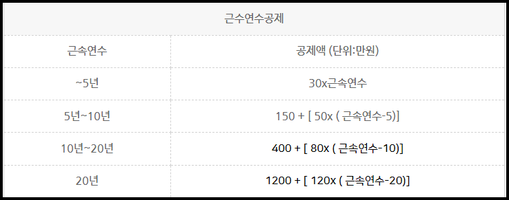 퇴직소득세를 산정을 할 때 근속연수 공제를 적용을 하게 되는데, 이는 근속연수에 따라서 공제하는 금액이 달라집니다.