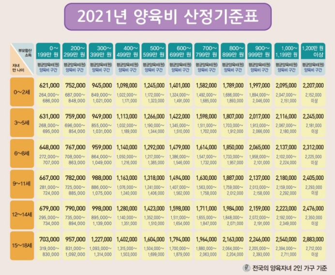 아래의 기준표를 통해서 볼 수 있지만 항상 기준표에 맞게 양육비가 결정이 되지는 않습니다. 비양육비권자의 경제사정과 자녀에게 특별한 교육비, 치료비가 발생을 할만한 특별한 경우도 발생을 할 수 있기 때문에 이러한 모든 상황을 종합해서 양육비가 책정이 됩니다.