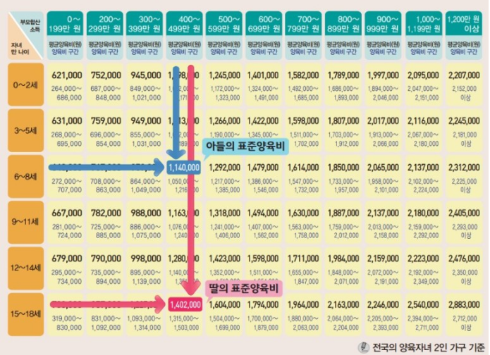 아래의 기준표를 통해서 볼 수 있지만 항상 기준표에 맞게 양육비가 결정이 되지는 않습니다. 비양육비권자의 경제사정과 자녀에게 특별한 교육비, 치료비가 발생을 할만한 특별한 경우도 발생을 할 수 있기 때문에 이러한 모든 상황을 종합해서 양육비가 책정이 됩니다.