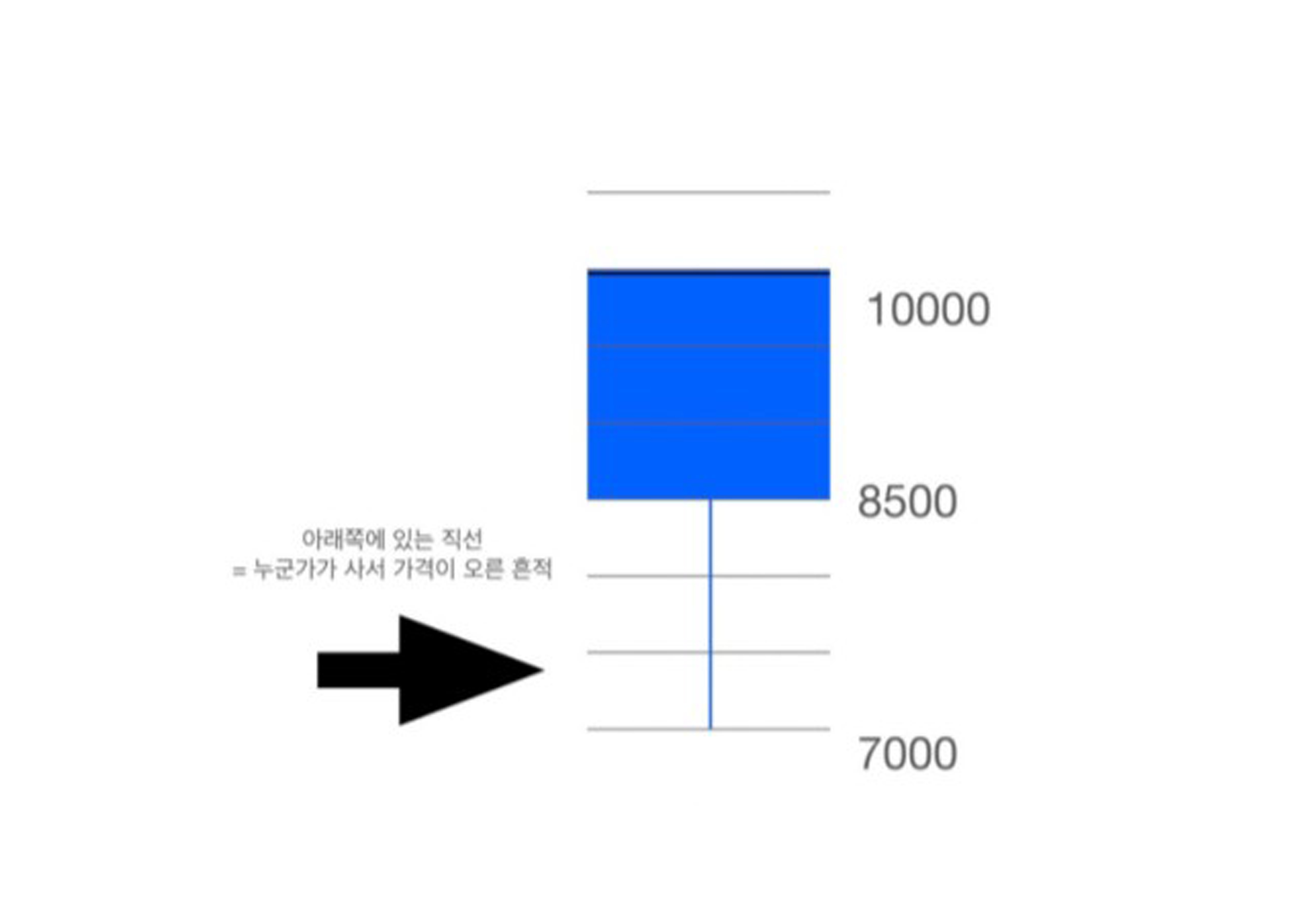 이렇게 윗꼬리가긴 파란색 캔들은 파란색이기 때문에 시작보다 끝난 가격이 낮구나 라고 생각을 하면되요. 10000원에서 시작을 해서 7000원에 끝났지만 윗꼬리가 13000원까지 그어져 있는 것을 보니 그냥 바로 7000원으로 떨어진 것이 아니라 한번 13000원까지 갔다가 7000원으로 내려갔네 라고 보시면 되요.