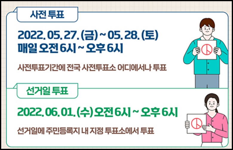 6월 사전투표는 5.27(금)~28(토)에 이루어집니다. 대통령 선거가 끝났고 취임식이 이루어졌고, 이제는 2022년 6월 1일 제 8회 전국 동시 지방선거가 남았습니다.
