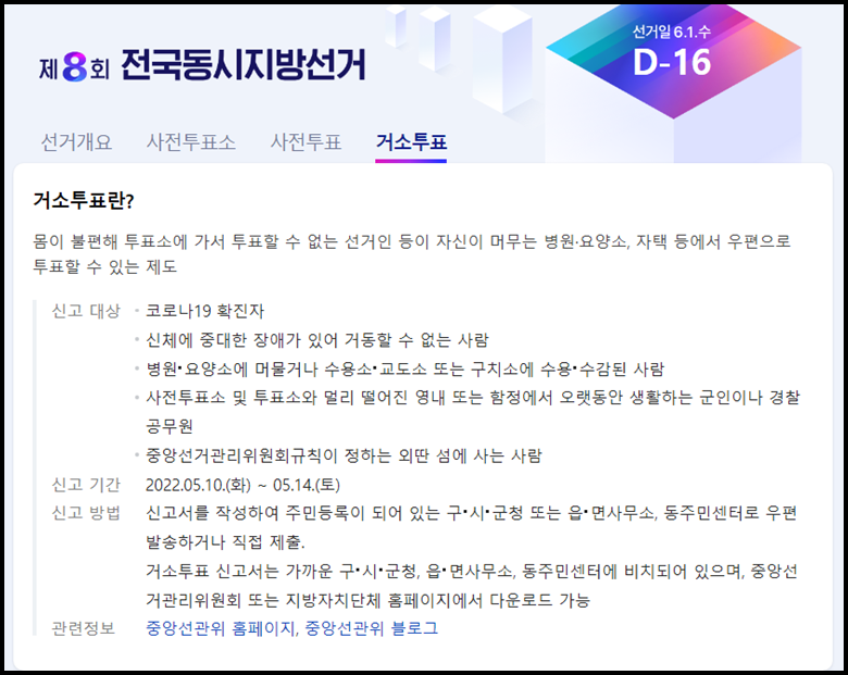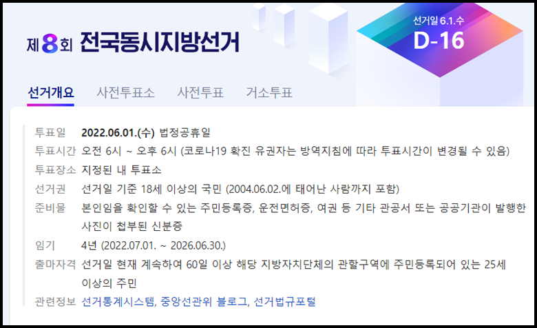 - 선거일 투표 : 6.1(수) 오전 6시부터 오후 6시까지