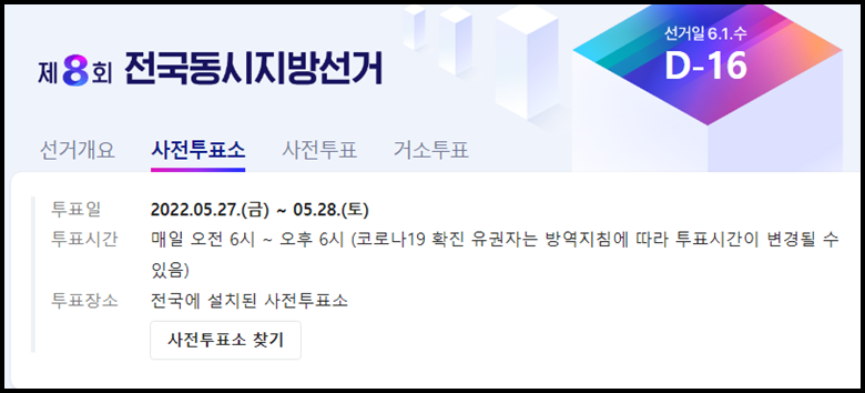 지방선거 사전투표소 찾기 서비스는 오늘 5/16일부터 시행가능합니다.