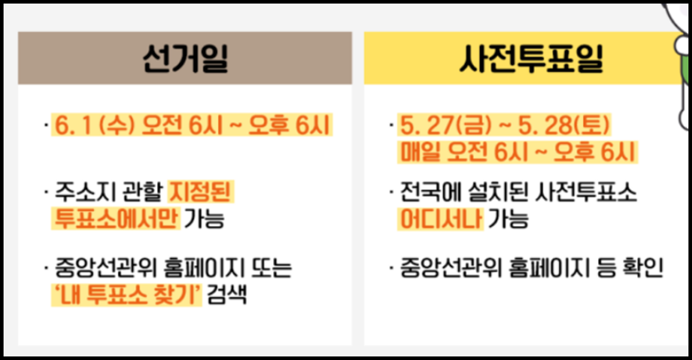 - 사전투표 : 5.27(금)~28(토) 오전 6시부터 오후 6시까지