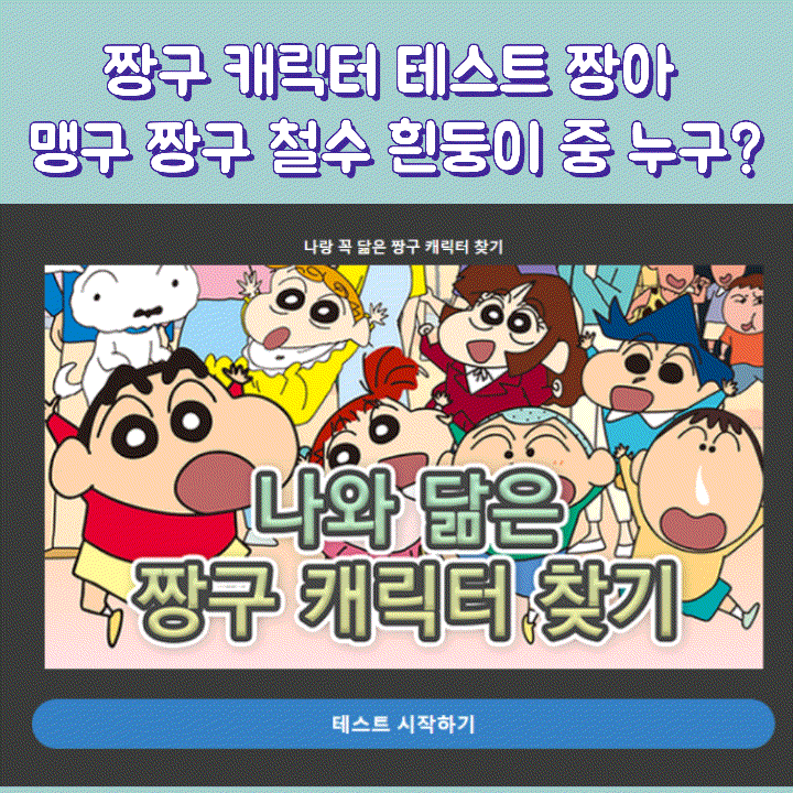 애니메이션 '짱구는 못 말려' 캐릭터를 등장시킨 테스트mbti가 등장해 화제로 '나랑 꼭 닮은 짱구 캐릭터 찾기' 테스트는 내 성격과 가장 유사한 만화 속 캐릭터를 찾아주는 재밌는 테스트입니다. 오늘은 짱구 캐릭터 테스트 주소 링크와 짱구 테스트 결과를 모두 알려드리겠습니다. 나는 어떤 캐릭터와 내가 가장 닮았는지 한번 테스트해보시길 바랍니다.