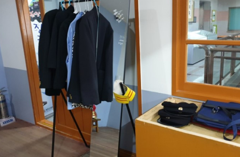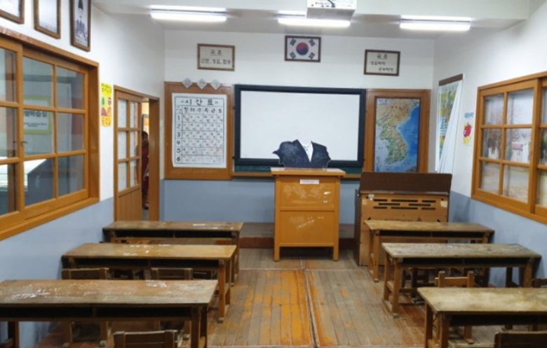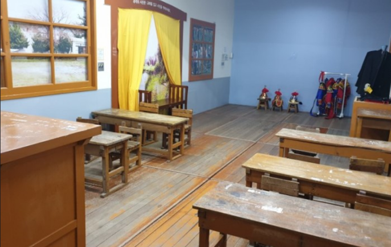 체험장에 나오면 복도쪽에 이렇게 옛날 교실이 있어요. 교실안에는 교복을 갈아입고 사진을 찍을 수 있게 옷과 소품이 있었는데 교복은 서연이에게 좀 컸고 그 마네킹들이입고있어서 무서워서 싫다고 하더라구요.