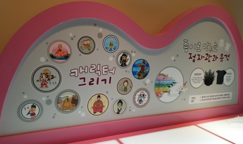 캐릭터 그리기를 서연이가 하고 싶었는데, 시간이 얼마 없어서 못하고 종이만 가지고 왔어요. 그리고 익선관과 정자관만들기도 있었는데 색칠을 해서 만드는 것이었는데 이것도 활동을 하지 못해서 집으로 가지고 왔네요
