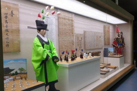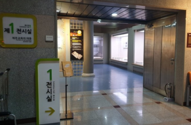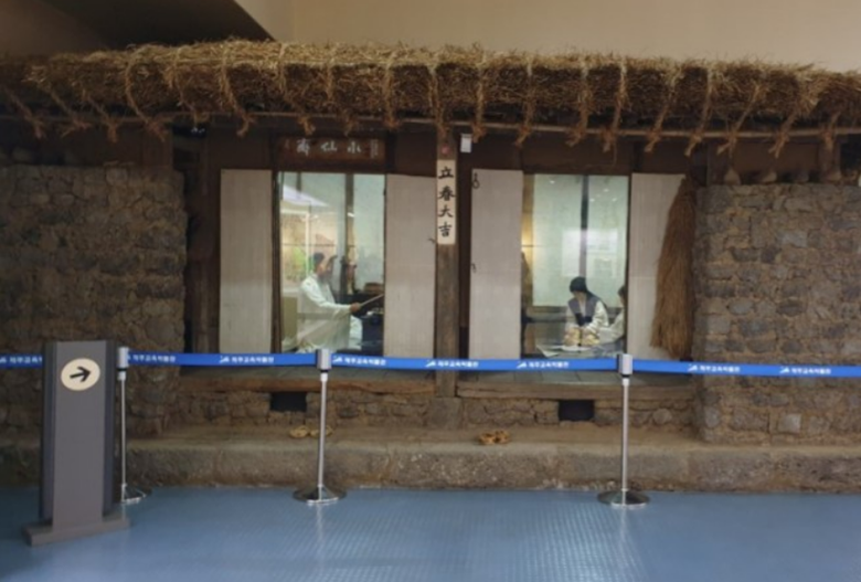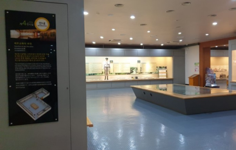 1전시장에는 고대로부터 해방 이전까지의 제주교육의 흐름을 제주교육의 뿌리 라는 주제로 19개 코너에 전시하고 있어요.이곳에 고려시대 및 조선시대의 교육코너가 미련되어 있는데, 서당을 재현한 제주 전통초가의 모습을 볼 수 있었어요
