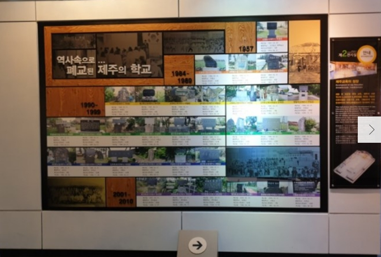제2전시실은 해방 후 제주교육의 자람이라는 주제로 15개 코너에 전시되어 있어요. 전시코너별 자료로 우선 제주교육의 발전과정을 보여주는 이미지컷으로 학생활동 사진으로 현대교육의 면모를 상징적으로 표현하였어요.