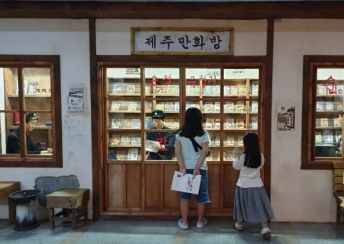 또한 세계여러나라의 교육에 대한 활동이 있어서 화면을 누르면 각나라에 대한 설명이 나와서 아이들이 직접 원하는 나라를 선택해서 할 수 있더라구요. 전시장을 나오면 이렇게 제주 만화방이 나와요.