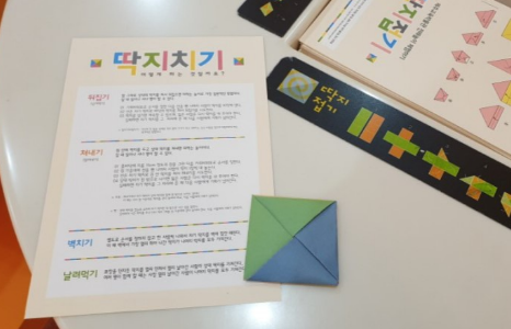 색연필이 아주 많이 써서 색이 진한게 없었는데, 진한 색을 좀 더 가져다 놓으면 더 좋을 것 같아요.우리나라 전통놀이인 딱지치기도 있었는데요. 딱지치기를 할 수 있게 종이도 있었어요