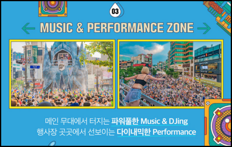 파워풀한 음악과 DJ 행사장 곳곳에서 펼쳐지는 다양한 퍼포먼스를 즐길 수 있습니다.