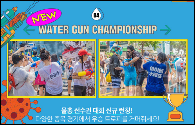 새롭게 선보이는WATER GUN CHAMPIONSHIP은 물총 선수권 대회인데 신규로 런칭해 다양한 종목 경기에서 우승 트로피를 거머쥘 수 있는 재미있는 대회입니다. 온 가족이 함께 즐길 수 있고 어린아이들도 더욱 안전하게 즐길 수 있는 KIDS&ATTRACTION ZONE은 아이들이 건전하게 즐기면서 여름날 최고의 추억을 남길 수 있는 프로그램이 될 것 갘습니다.