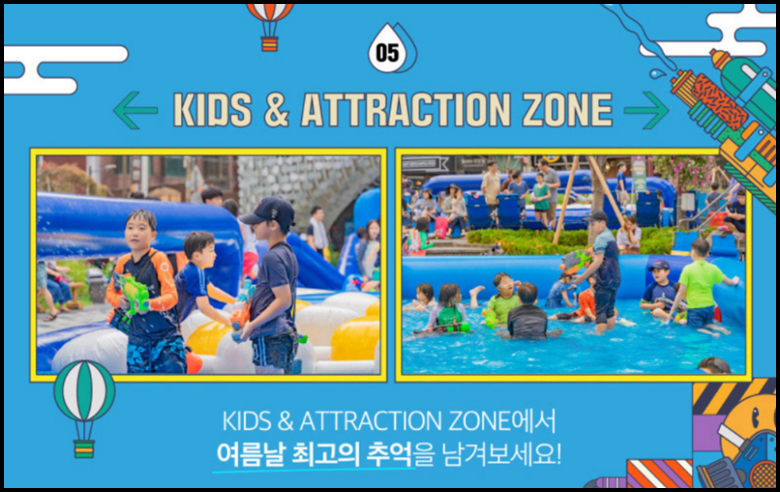 물총 싸움과 시원한 물대포를 맞을 수 있는 워터 어트랙션을 포함한 다양한 서브 프로그램은 누구나 부담없이 참여하실 수가 있습니다.