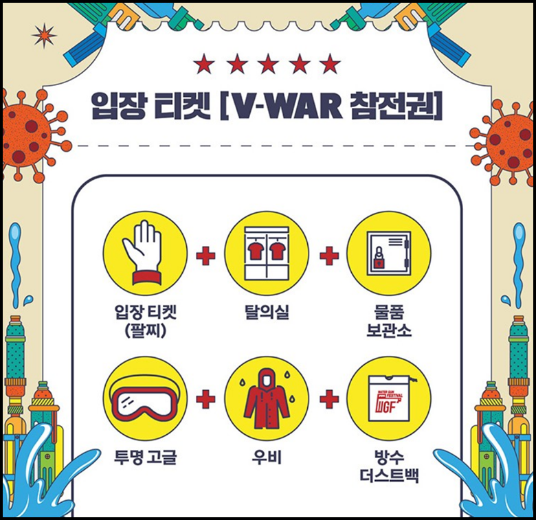 구매한 입장티켓 V-WAR 참전권에는 입장 티켓+탈의실+물품보관소 +투명고글+우비+방수더스트백 이용이 가능하답니다
