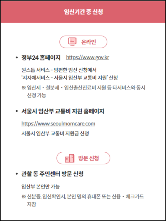 - 정부24시 홈페이지에서 원스톱서비스- 맘편한 임신신청- 지자체서비스- 서울시 임산부 교통비 지원 신청