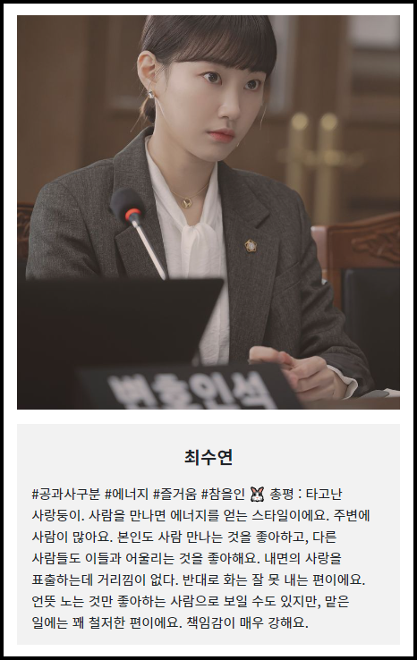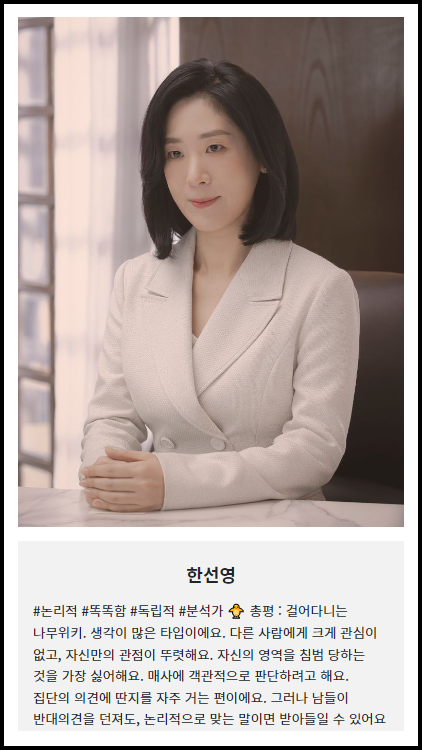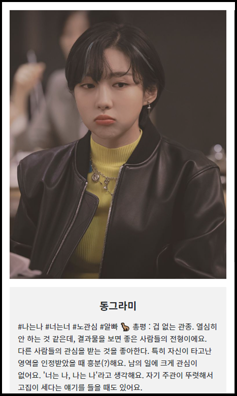 들어가 보시면 이렇게 다른 등장인물에 대한 설명과 어떤 테스트 결과의 유형이 나오는지 전체적으로 보실 수 있습니다. 드라마를 보시는 분들이라면 등장인물들의 성격을 생각해 보시면서 얼마나 맞는지 따져보면 재밌습니다.