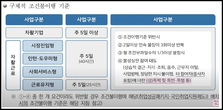 조건부 수급자가 자활사업에 참여하지 않는 조건 불이행을 한다면 생계급여를 수급 받지 못합니다. 아래 사진에 나온 총 4개의 조건 중 단 1개라도 만족시키지 못하면 조건 불이행으로 보고 생계급여를 지급하지 않습니다.
