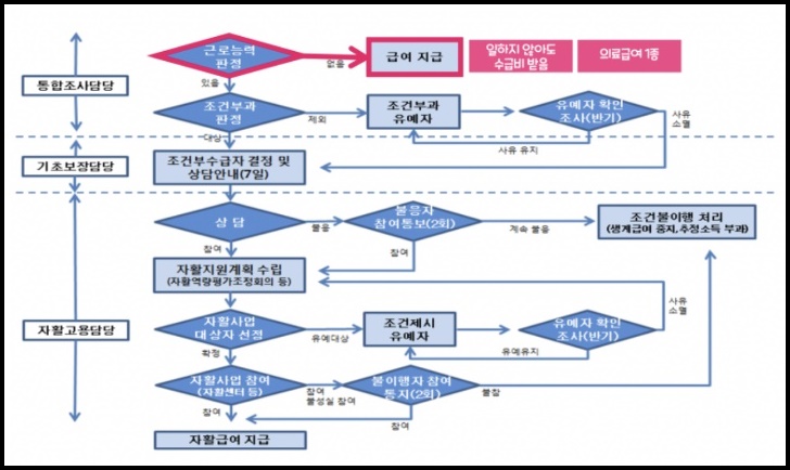 조건부 수급자 라는 것은 근로능력이 있는 수급자 중 자활사업 참여 조건으로 생계급여를 지급하는 자들을 뜻합니다. 정부에서는 생계급여 신청을 받으면 근로 능력이 있는지 먼저 판단 후 조건부 수급자로 선정할지 일반 수급자로 선정할지 판단하게 됩니다.