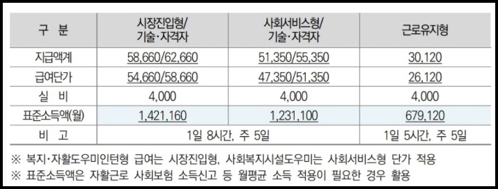 보건복지부가 제공하는 자활사업에 참여하는 경우, 유형에 따라 위에 표에 나온 급여를 받을 수 있습니다. 시장 진입형이나, 사회서비스형은 1일 8시간 주 5일 근무하게 되고 근로유지형은 근로능력과 의욕이 낮은 분들을 대상으로 하기에 1일 5시간만 일합니다. 복지-자활 도우미 인턴형은 시장 진입형의 단가를 사회 복지시설 도우미는 사회서비스형의 단가가 적용됩니다.
