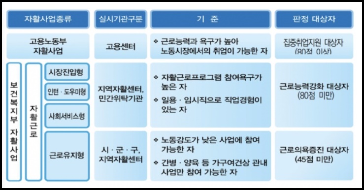 평가점수가 80점 미만인 경우, 보건복지부에서 시행하는 자활사업에 참여하게 됩니다. 하는 일에 따라, 시장 진입형, 인턴 도우미형, 사회서비스형, 근로유지형으로 나누게 됩니다.