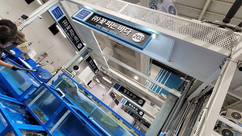 꽃피는 바다의 경우 수산동 GATE1번으로 들어가시면 됩니다. 영업시간은 가게마다 차이가 있다고 해요. 제가 퇴근하고 갔을 때는 7시가 좀 넘은 시간이었는데 채소동과 과일동은 몇곳 빼고는 다 문이 닫은 상태였어요. 수산동은 그에 비해 문을 열고 있는 곳이 많았는데, 미리 전화로 오픈하고 있는지 물어보고 방문을 하는 것이 안심이 되겠죠.