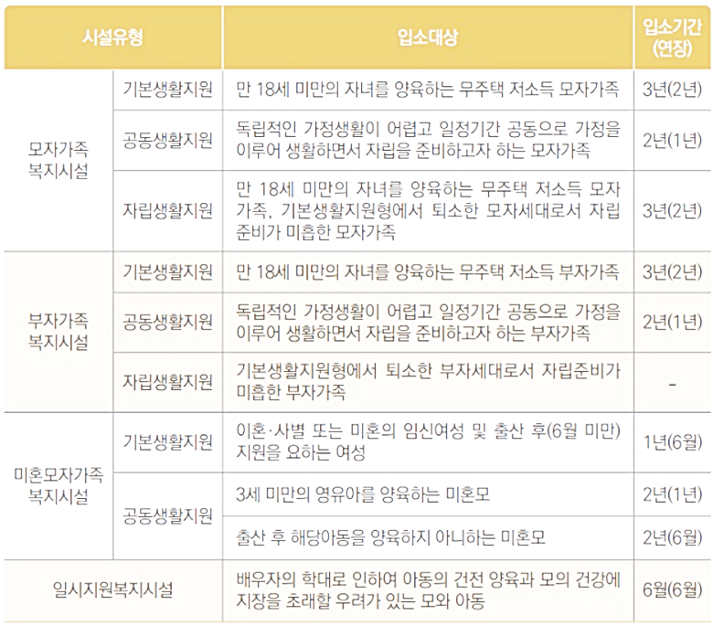 ▷ 생활보조금 : 한부모가족복지시설에 입소하는 경우 가구당 월 5만원