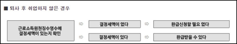 퇴사 후 받은 원천징수영수증의 결정세액란을 확인해봤을 때 세액이 0원이라면 5월 종합소득세 확정신고를 하지 않아도 되며 세액이 0원 이라는 의미는 더이상 환급받을 세금이 없다는 의미입니다. 퇴사한 회사로부터 근로소득원천징수영수증을 받지 못했다면, 퇴사 다음 해 3월 회사의 지급명세서 제출기한 이후 홈택스에서 직접 조회가 가능합니다.