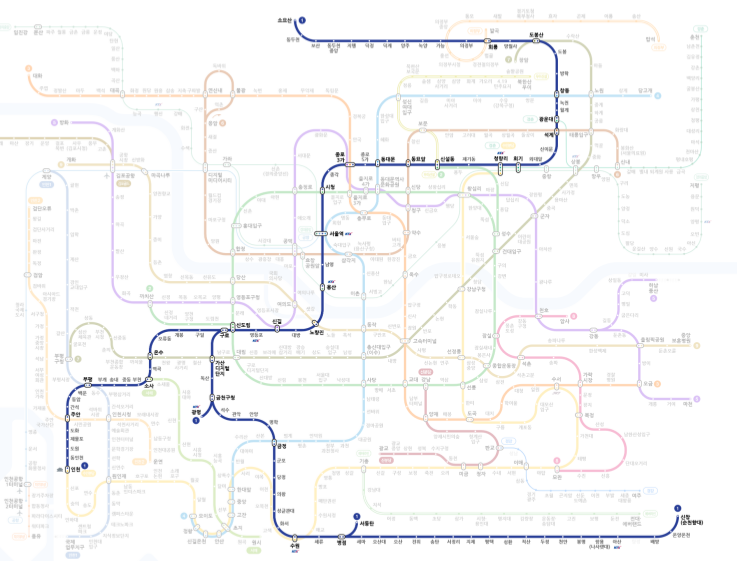 청량리부터 가산디지털단지까지는 1호선 노선대로 쭉 가고, 그 이후에는 정차가 되는 것이 달라집니다.