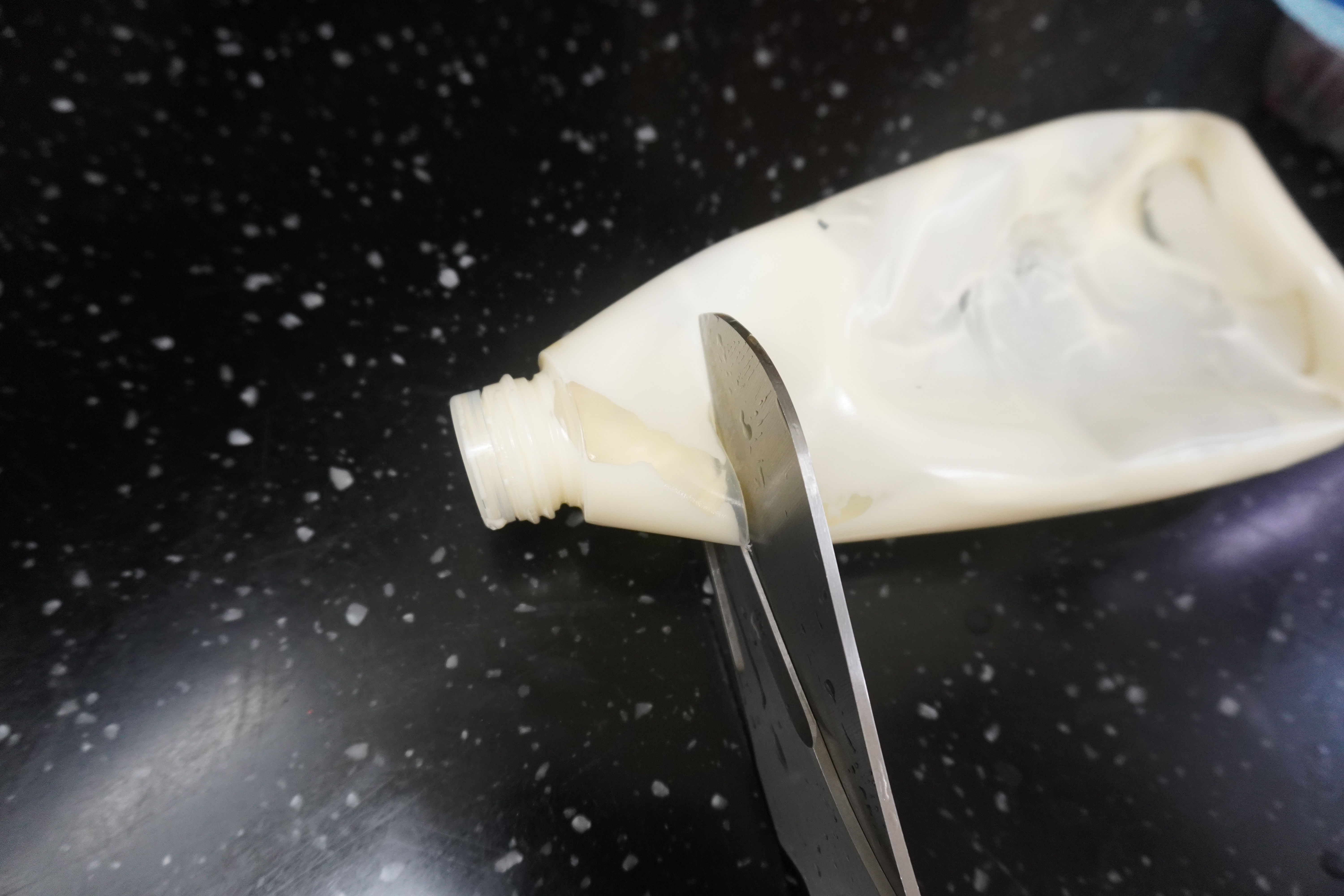 안에 있는 마요네즈는 깨끗하게 닦아서 버리는 것이 좋겠죠? 가위로 잘라줍니다.