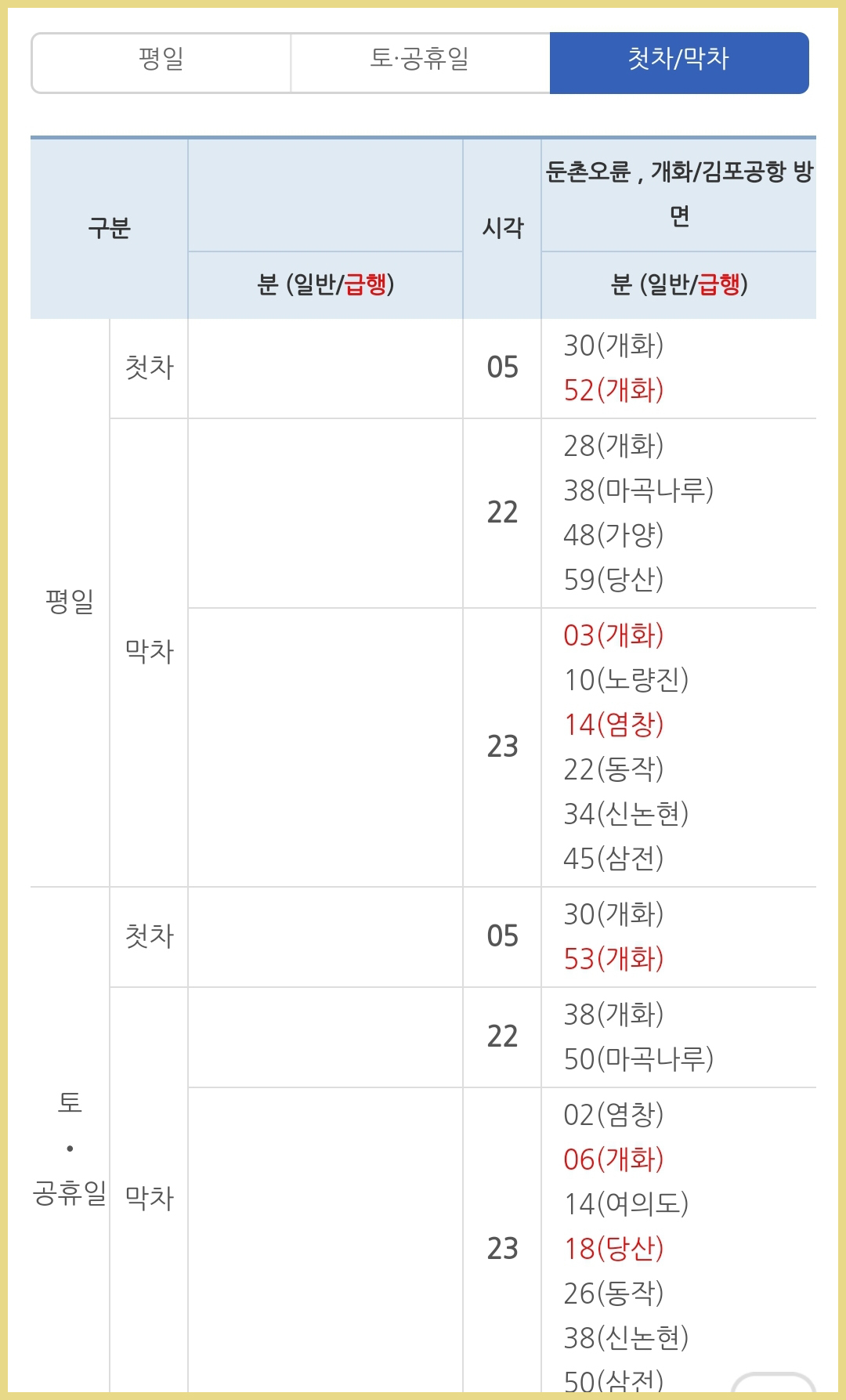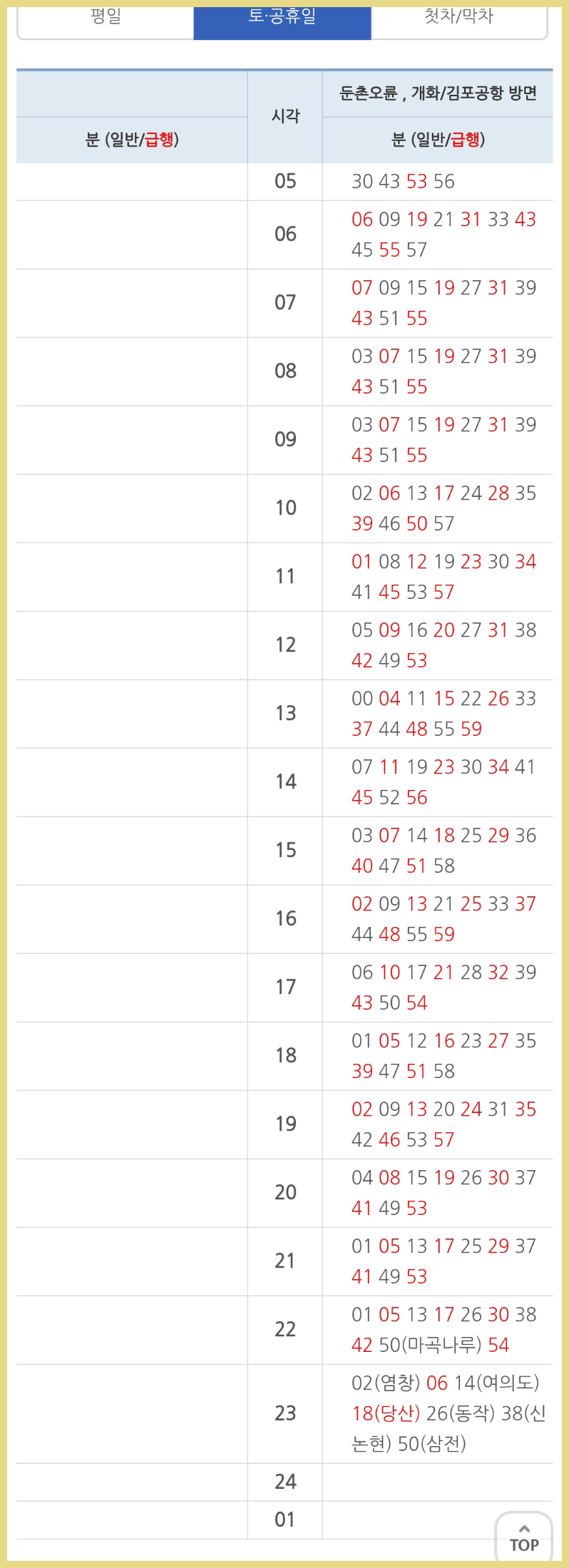 토요일, 공휴일 시간표이고, 급행의 경우 빨간색으로 표시가 되어있으니 참고해주세요.