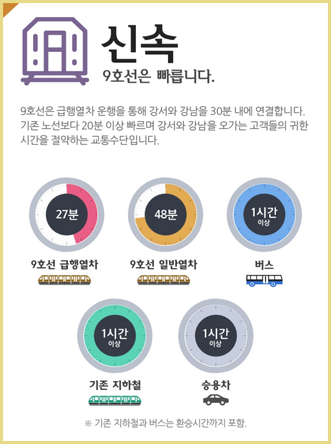 버스는 한시간이상걸리고, 승용차도 버스와 같은 1시간 이상인데, 길이 밀리면 더 오랜시간이 걸립니다. 기존 9호선은 48분 걸렸다면 9호선급행열차는 28분 걸립니다.