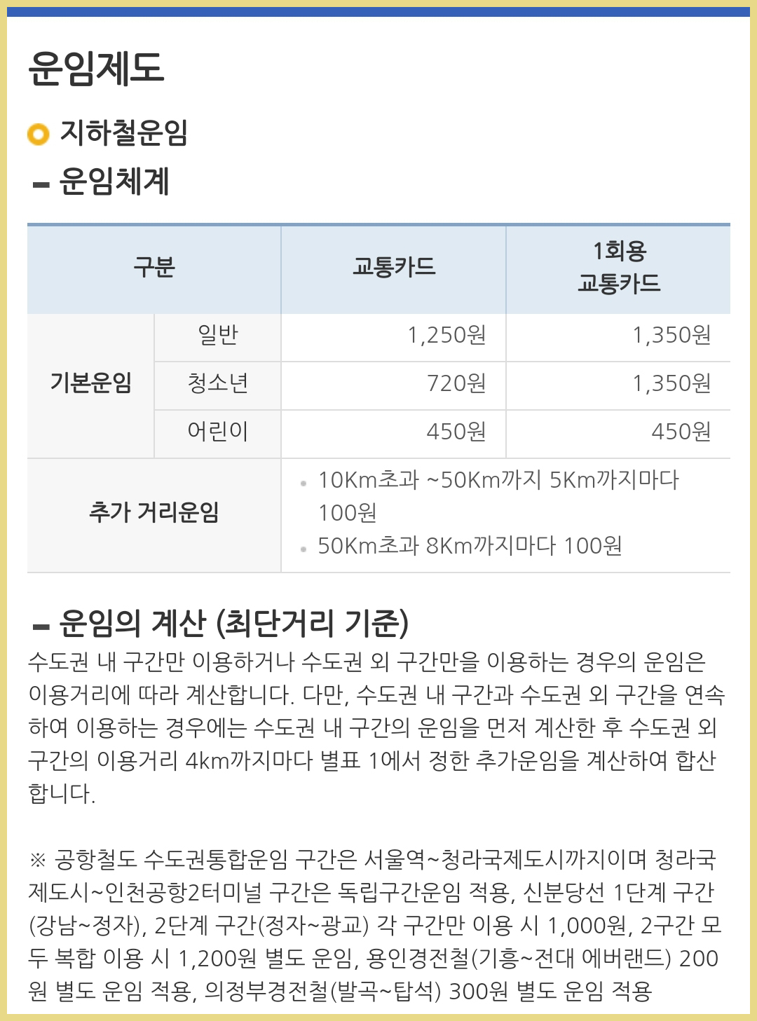 운임료는 일반(성인)의 경우 교통카드를 사용할 경우는 1,250원이고, 1회용 교통카드는 1,350원이에요. 청소년은 교통카드 사용시 720원 1회용 교통카드일 경우에는 성인과 동일한 금액이에요.