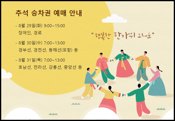 추석 승차권 예매 안내 - 8월 29일(화) 9:00~15:00 장애인, 경로 - 8월 30일(수) 7:00~13:00 경부선, 경전선, 동해선(포항) 등 - 8월 31일(목) 7:00~13:00 호남선, 전라선, 강릉선, 중앙선 등