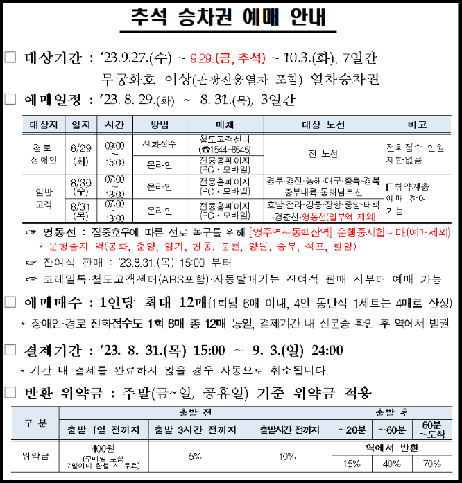 2023년 추석 코레일 예매 일정 팁에 대해서 알아보았습니다. 참고하시기 바랍니다.