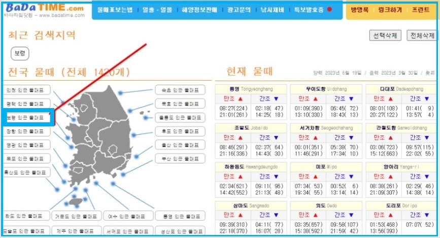 위에 그림처럼 본인이 가고자 하는 지역을 클릭하고 물때표를 확인 하거나, 상단 검색창에서 직접 지역을 입력해 물때를 확인하실수 있습니다.
