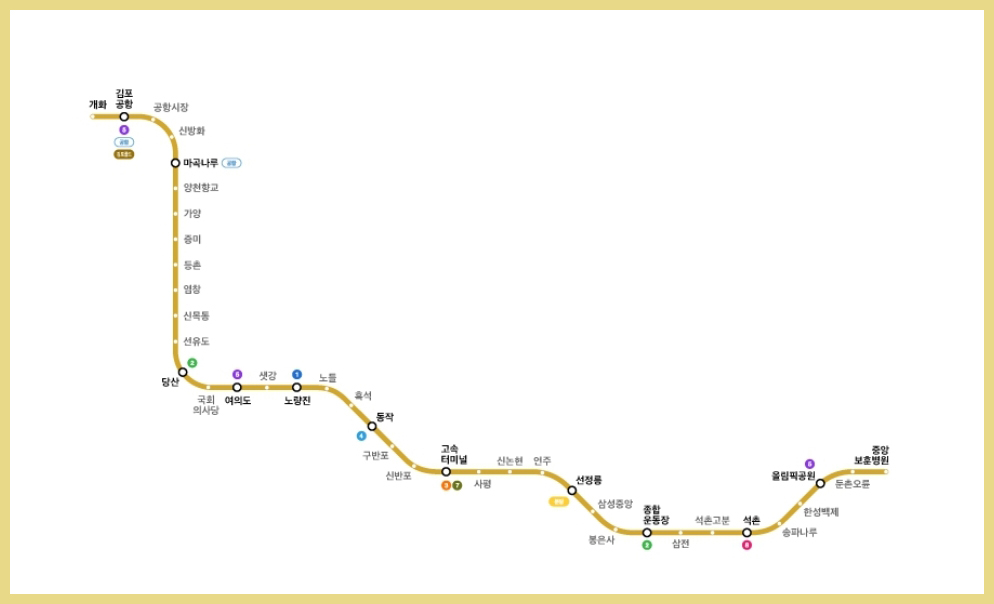 개화-김포공항-공항시장-신방화-마곡나루-양천향교-가양-증미-등촌-염창-신목동-선유도-당산-국회의사당-여의도-샛강-노량진-노들-흑석-동작-구반포-신반포-고속터미널-사평-신논현-연주-선정릉-삼성중앙-봉은사-종합운동장-삼전-석촌고분-석촌-송파나루-한성백제-올림픽공원-둔촌오륜-중앙보훈병원